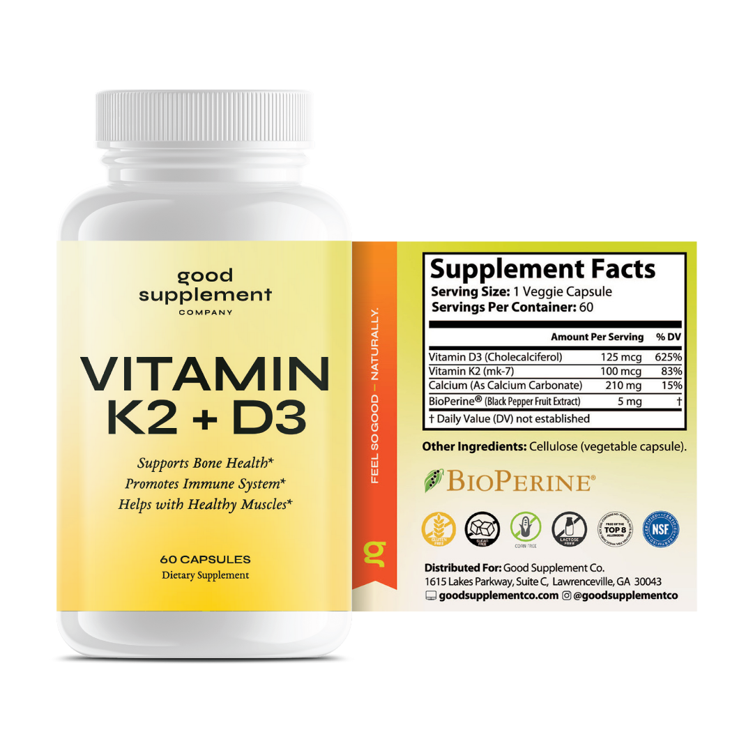 - Vitamin D3 + K2 – Promotes strong bones, supports immunity, and helps direct calcium to the right places (your bones, not your arteries). The two work synergistically for optimal effectiveness.